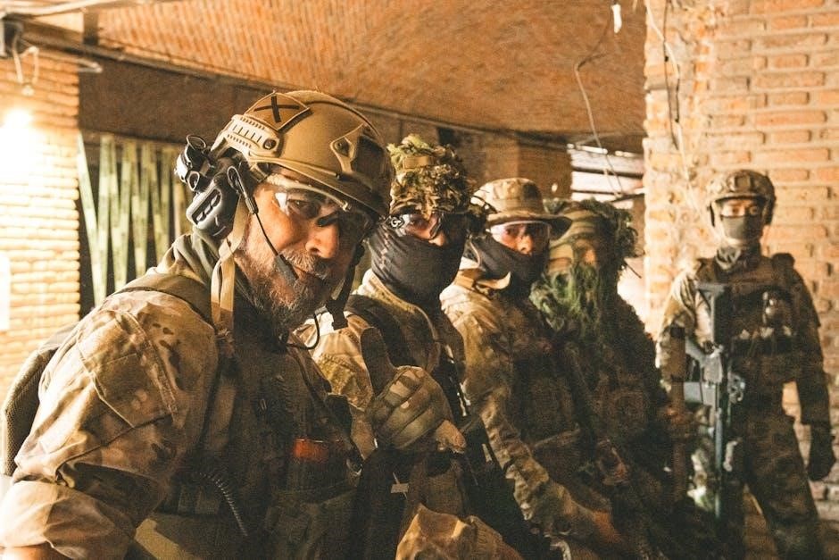Close Quarters Battle (CQB)‚ or urban operations‚ demands specialized tactics due to the confined spaces and increased risk of civilian casualties. CQB prioritizes speed‚ surprise‚ and overwhelming firepower to rapidly neutralize threats within structures. Teams employ dynamic entry techniques‚ utilizing breaching tools and coordinated movements to gain access.